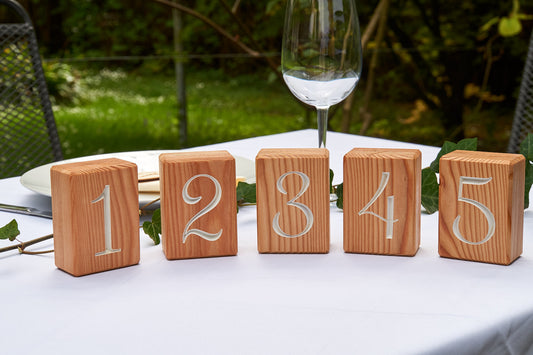 Wooden tables marking at events (from 1-20) in white and black - rental